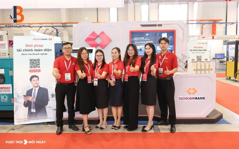 Đồng phục áo thun ngân hàng Techcombank với tông màu đỏ chủ đạo