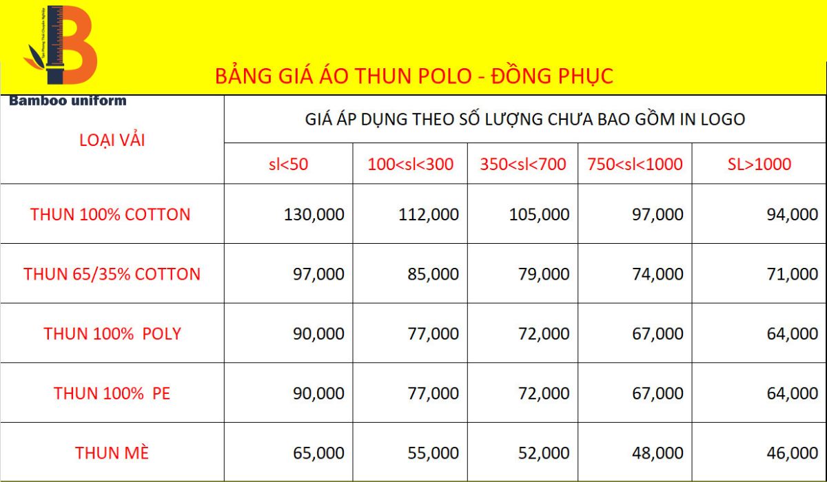 Lưu ý, bảng giá trên chỉ mang tính chất tham khảo và sẽ thay đổi theo thời gian. Ngoài ra, có rất nhiều tiêu chí ảnh hưởng đến giá bán đồng phục áo thun. Do đó, để biết giá chính xác, khách hàng vui lòng liên hệ trực tiếp Bamboo Uniform.