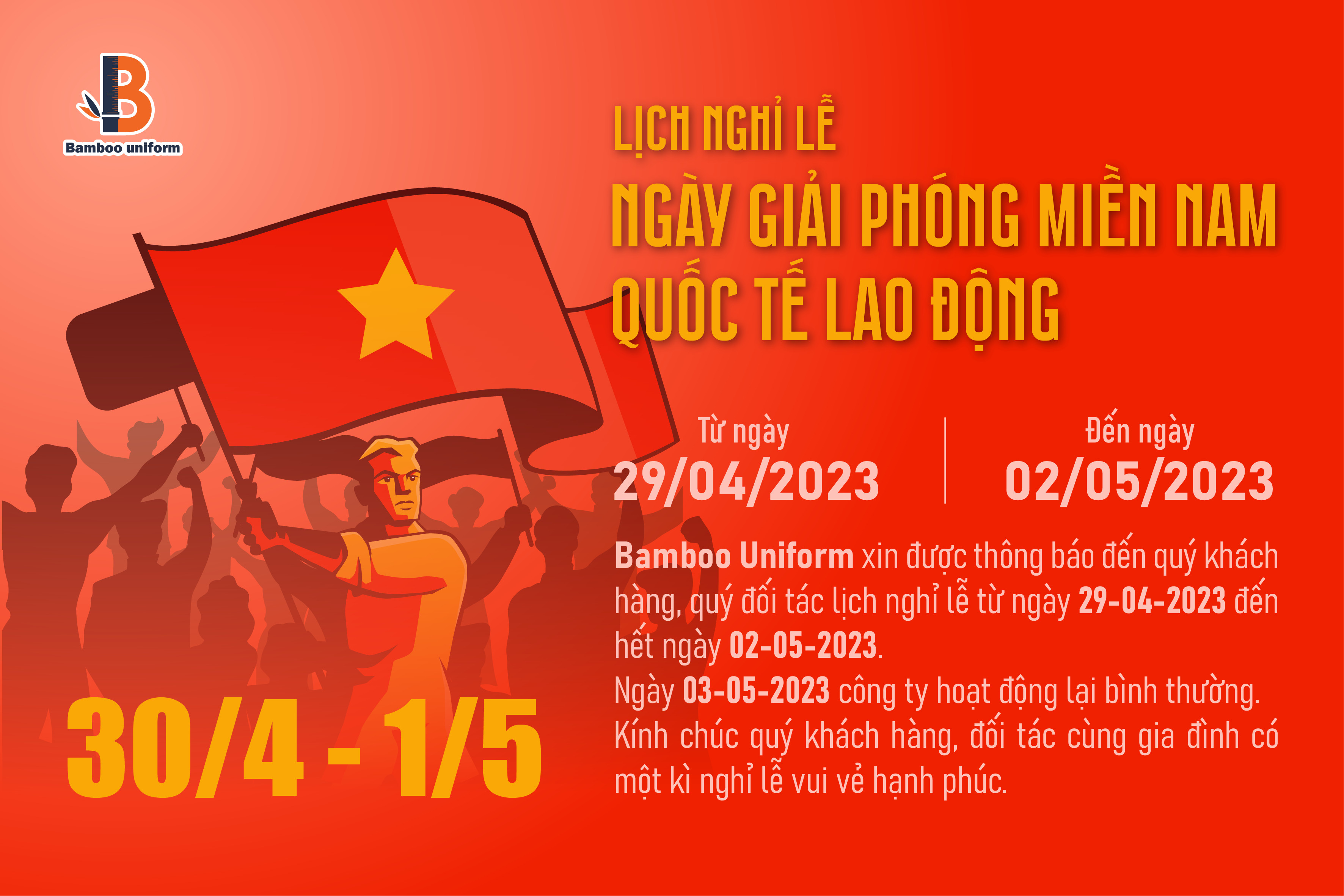 Công ty Bamboo Uniform xin thông báo tới quý vị về lịch nghỉ lễ Ngày Giải Phóng Miền Nam và Quốc Tế Lao Động 30/04 - 01/05 như sau:
